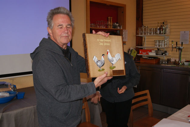 Der scheidende Präsident, Jürg Schmid, wurde von Andy Kräuchi mit einem gefühlvollen Gedicht aus dem Amt entlassen und ebenfalls mit seiner Lieblingsrasse, den Spitzhauben silber-schwarzgetupft, auf der Holztafel als neues Passivmitglied des Klubs begrüsst. Wie die Aktiven bezahlen die Passiven ab 2020 denselben Jahresbeitrag von Fr. 40.00 - weil sie die Arbeit der Züchtenden unterstützen und die Spitzhauben, Barthühner und Schweizerhühner fördern helfen wollen.